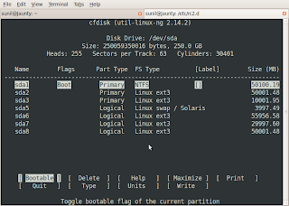 You can examine the screen and find out the Linux partitions . If you have multiple installations , this can be tricky. You can quit from cfdisk and return to terminal. Now, try to mount the desired partition into some directory. ( Assuming that you Linux partition is /dev/sda2 , the following commands are described.)